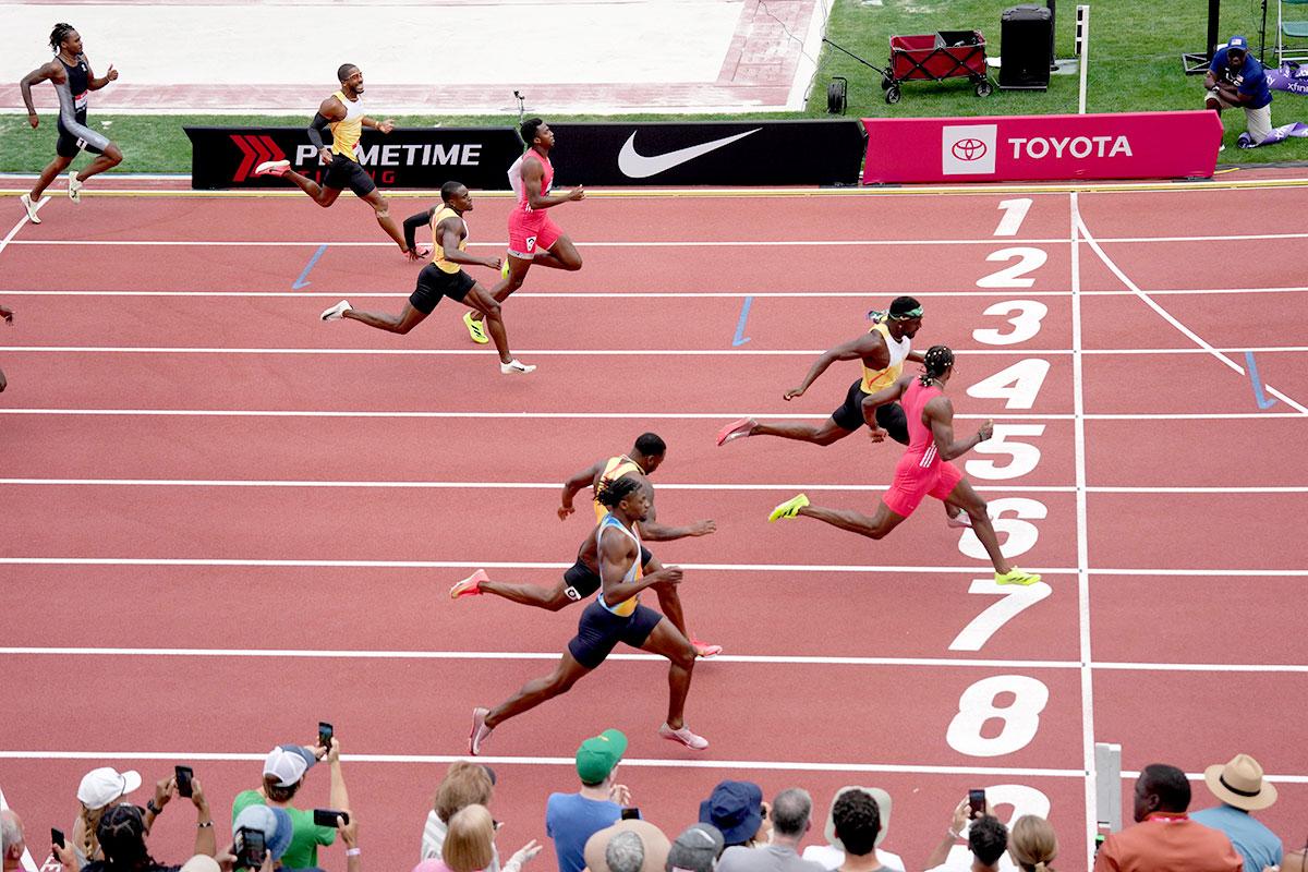IMAGE: Noah Lyles (7) defeats Kenny Bednarek (6) to win the 200 metres, 19.63 to 19.67, in an ill-tempered race during the USATF Championships at Hayward Field, Eugene, Oregaon, USA. Photograph: Kirby Lee-Imagn Images/Reuters