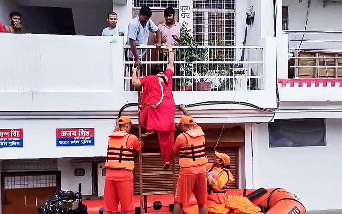 IMAGE: NDRF teams rescue people stuck in their houses due to severe waterlogging in low-lying areas in Prayagraj. Photograph: NDRF/ANI Photo