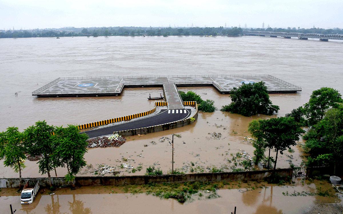 IMAGE: A view of a partially submerged helipad as the waters of the Ganga and Yamuna cross the warning level in Prayagraj. Photograph: ANI Photo
