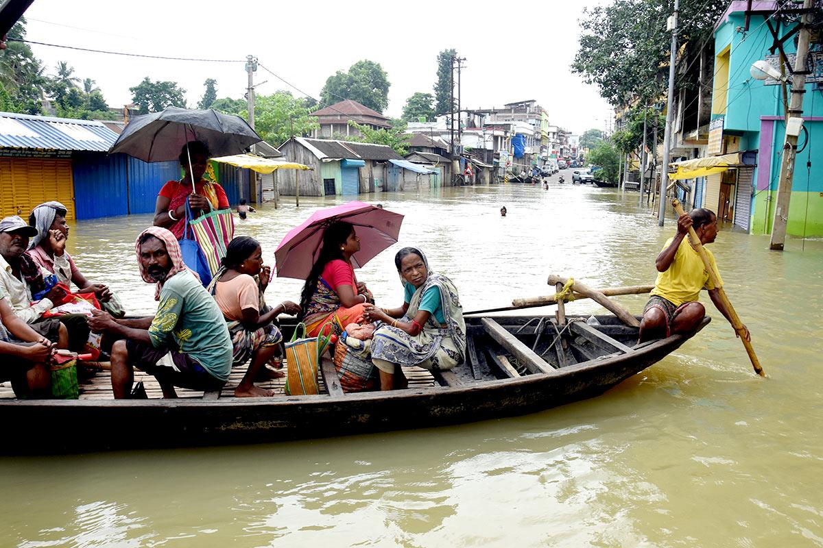 IMAGE: People use boats to commute through waterlogged road at Ghatal city in West Medinipore, West Bengal, due to incessant heavy rainfall and release of water from the DVC barrage. Photograph: ANI Photo