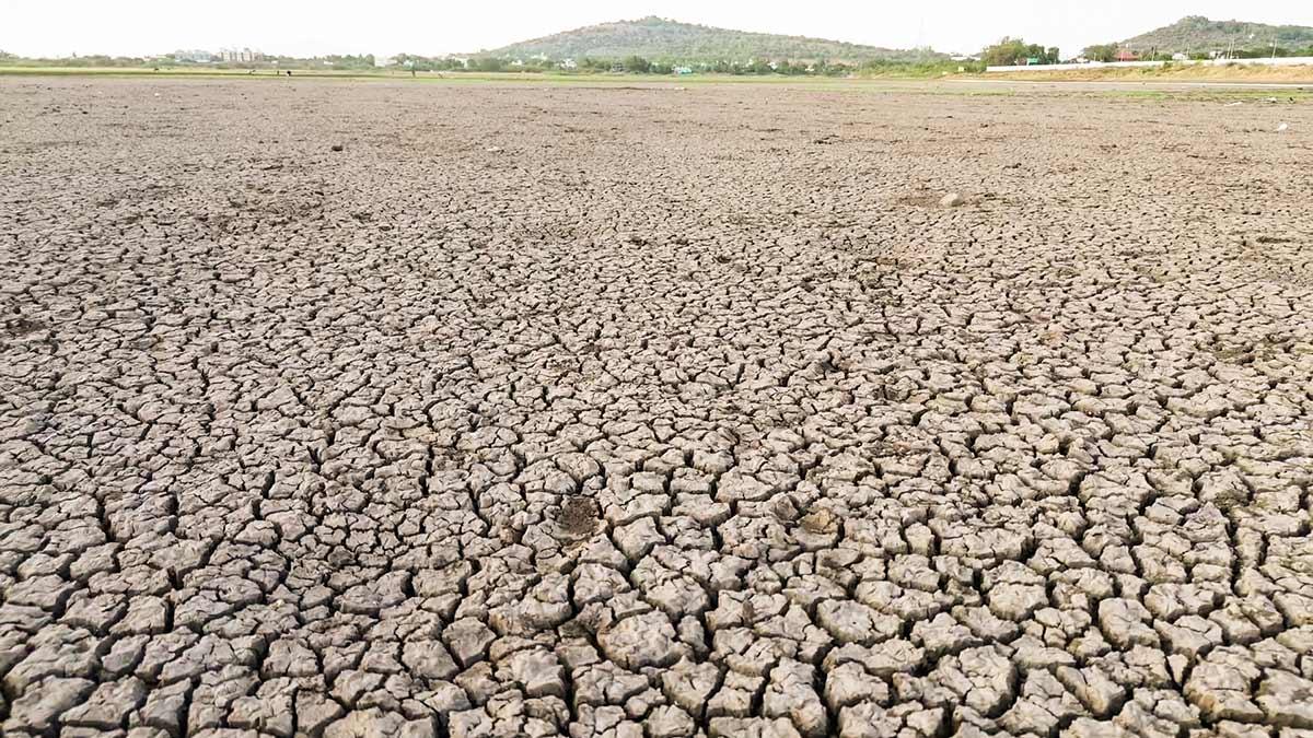 IMAGE: The Thenkal Kanmai tank in Thiruparankundram, one of the major water bodies in Madurai, has dried up this year due to an intense heatwave. Photograph: ANI Video Grab