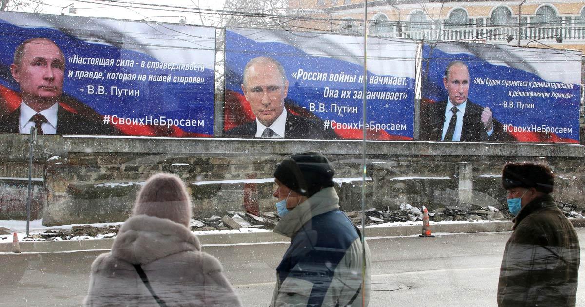 The boards read: Left: 'The real power is in justice and truth, which is on our side'. Centre: 'Russia doesn't start wars, Russia ends them'. Right: 'We want the demilitarisation and denazification of Ukraine'. Photograph: Alexey Pavlishak/Reuters