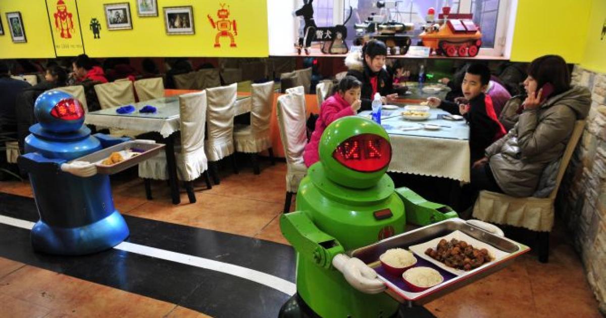 Robots deliver dishes to customers at a Robot Restaurant. Opened in June 2012, the restaurant has gained fame in using a total of 20 robots to cook meals and deliver dishes. The robots can work continuously for five hours after a two-hour charge, and are able to display over 10 expressions on their faces and say basic welcoming sentences to customers, Harbin. Photograph: Sheng Li/ Reuters