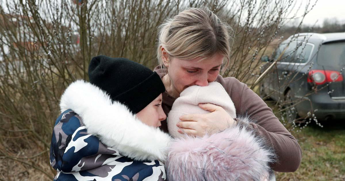 IMAGE: Anna Semyuk, 33, hugs her children at the Beregsurany border crossing in Hungary.