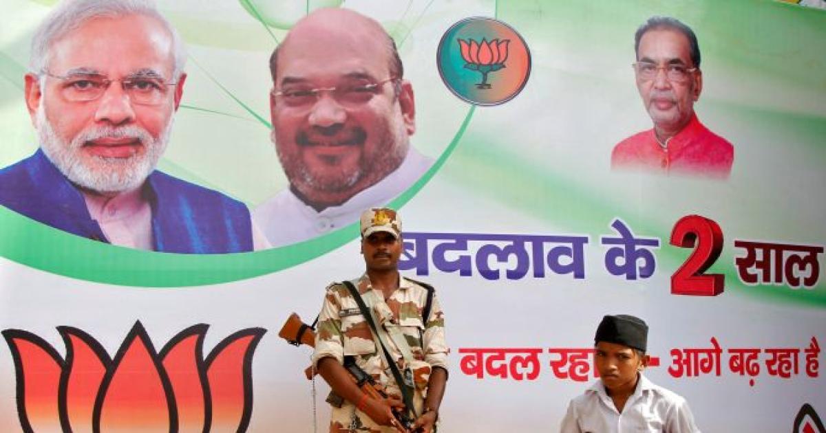 IMAGE: A policeman stands guard as a Rashtriya Swayamsevak Sangh volunteer looks on beside a hoarding featuring Prime Minister Narendra Modi and BJP President Amit Shah in Allahabad. Photograph: Jitendra Prakash/Reuters