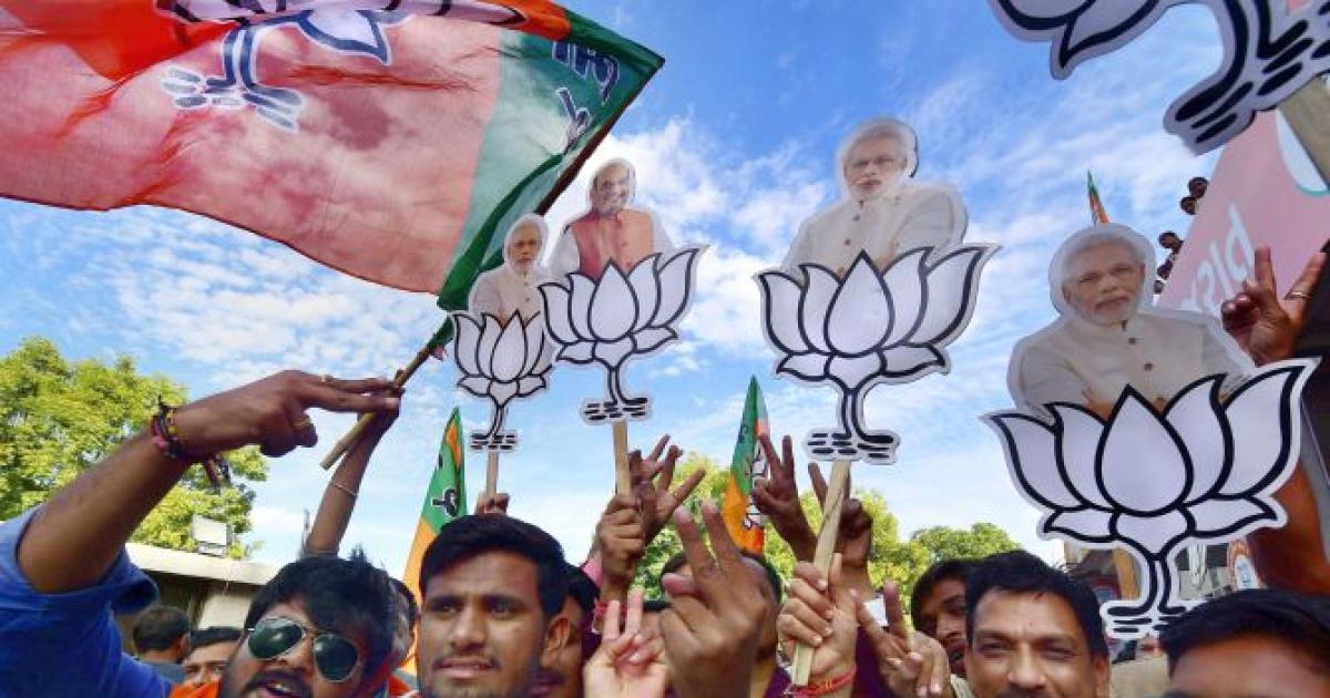 Image: BJP workers celebrate their victory in the Gujarat and Himachal Pradesh assembly elections in Gandhinagar. Photograph: Santosh Hirlekar/ PTI Photo