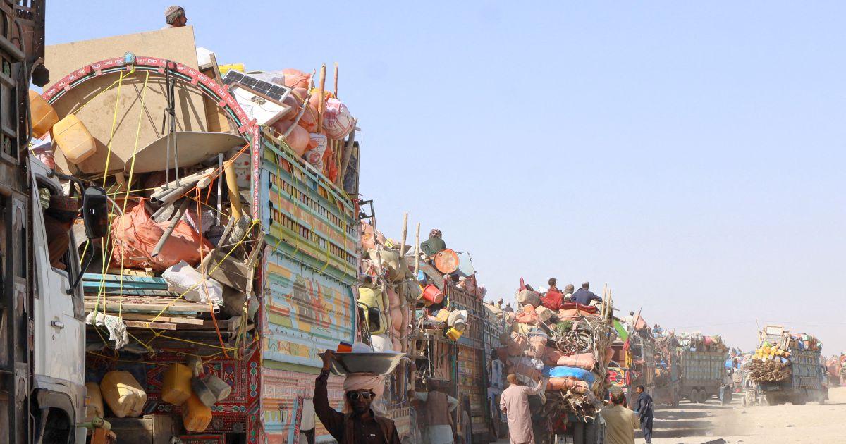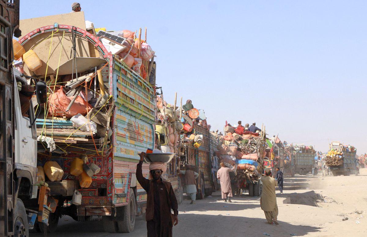 IMAGE: Vehicles loaded with the belongings of Afghan citizens stand parked, as they attempt to return to their country, after Pakistan closed border crossings with Afghanistan following exchanges of fire between the two nations' forces, at the border crossing in Chaman, Balochistan Province, Pakistan October 13, 2025. Photograph: Saeed Ali Achakzai/Reuters