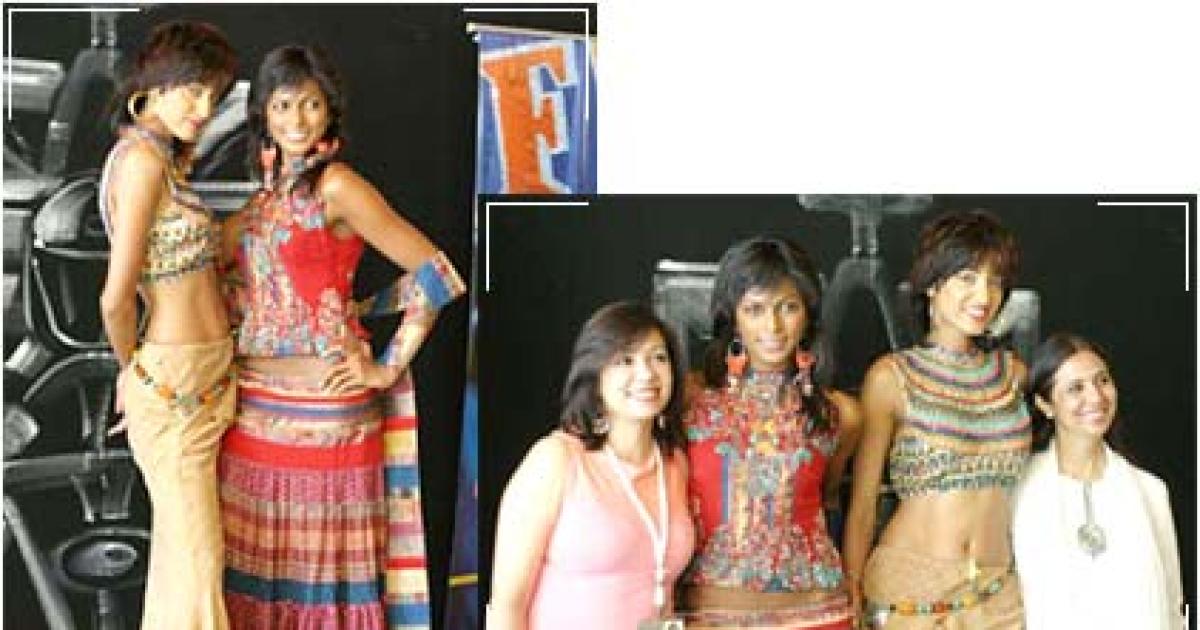 As model Jessae Randhawa (above, left) shows off a rich Eyptian-inspired embroidered top with a khaki-coloured wraparound skirt, Ashima explains: "I picked up semi-precious stones and embroidered over them. The print of the wraparound skirt is inspired by the sand dunes. It is shaken-up stripes."
