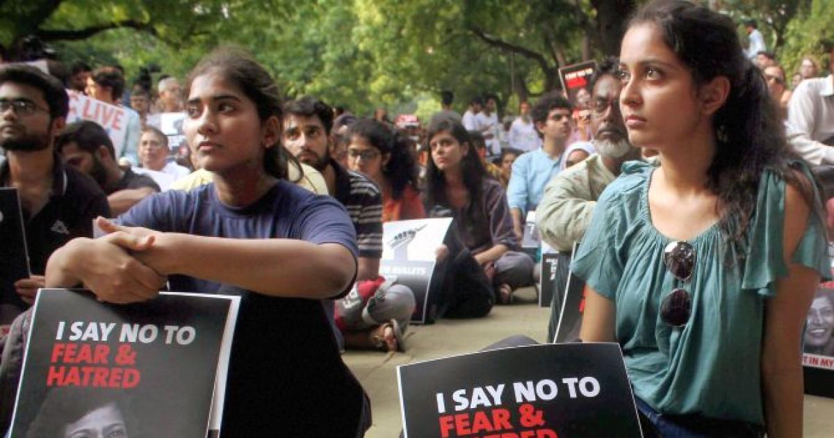 IMAGE: Demonstrators hold placards with the picture of Gauri Lankesh during a 'Not In My Name' protest at Jantar Mantar in New Delhi on Thursday. Photograph: PTI Photo