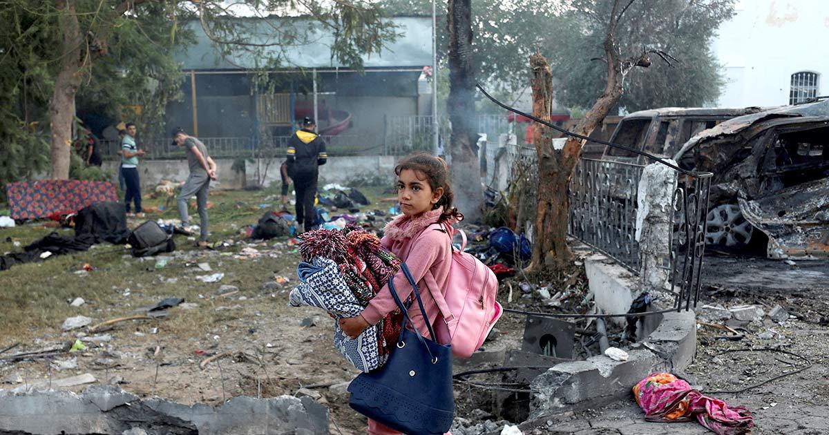 IMAGE: A girl carrying her belongings walks in the Al-Ahli hospital the day after Palestinians were killed in a blast on Tuesday evening. Photograph: Mohammed Al-Masri/Reuters