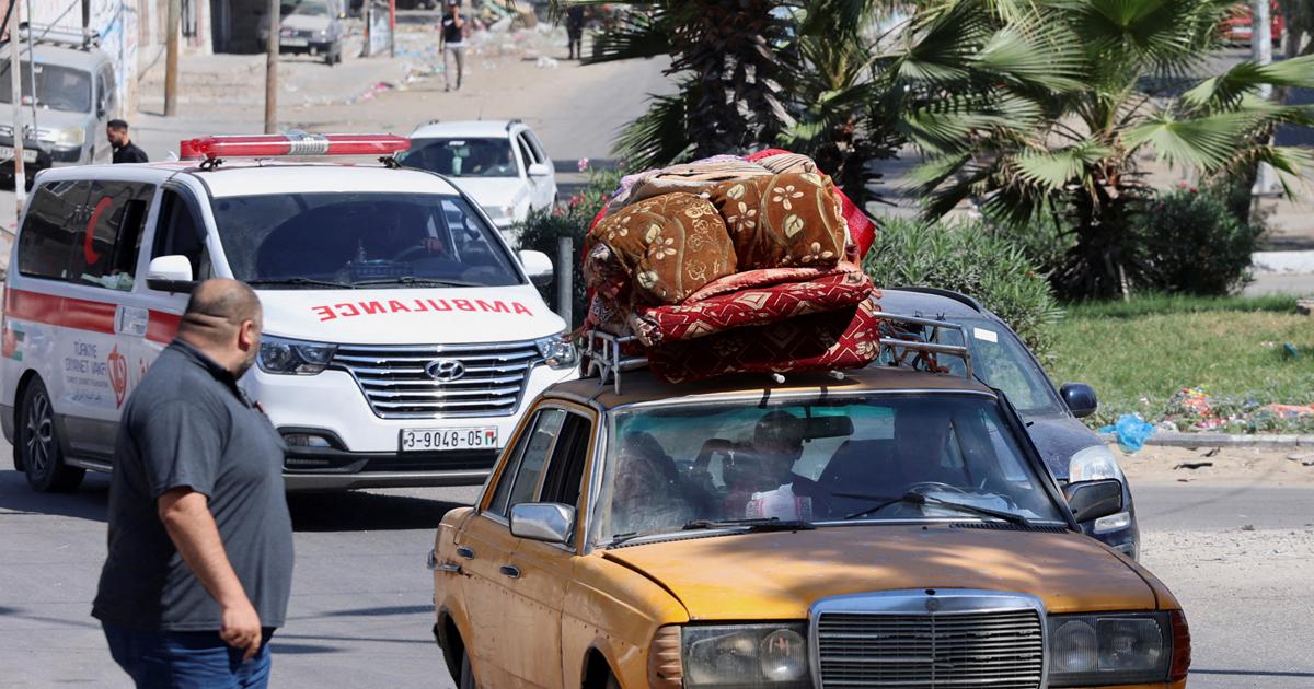 IMAGE: Palestinians flee their homes heading toward the southern part of the Gaza Strip after Israel's call for more than 1 million civilians in northern Gaza to move south within 24 hours, October 13, 2023. Photograph: Ahmed Zakot/Reuters