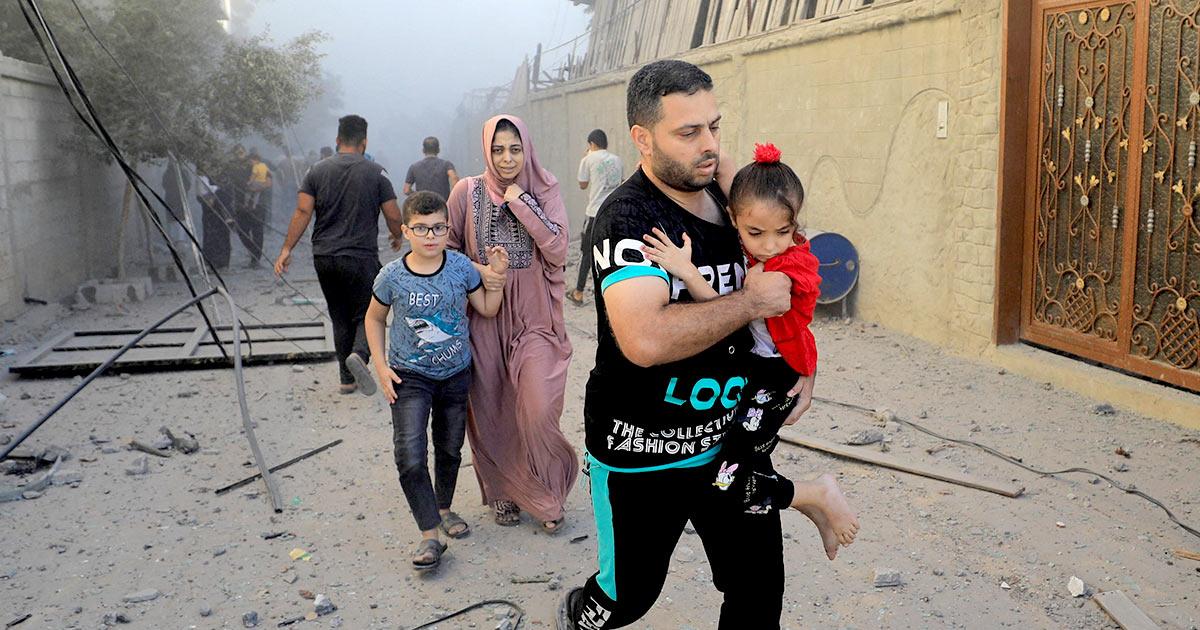 IMAGE: Palestinians evacuate the site of Israeli strikes on houses, in Maghazi refugee camp in the central Gaza Strip, on November 6, 2023. Photograph: Yasser Qudih/Reuters
