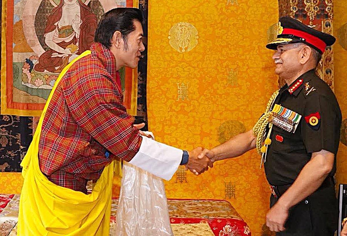 IMAGE: General Dwivedi meets the Bhutanese king, here and below. All photographs: @adgpi X/ANI Photo