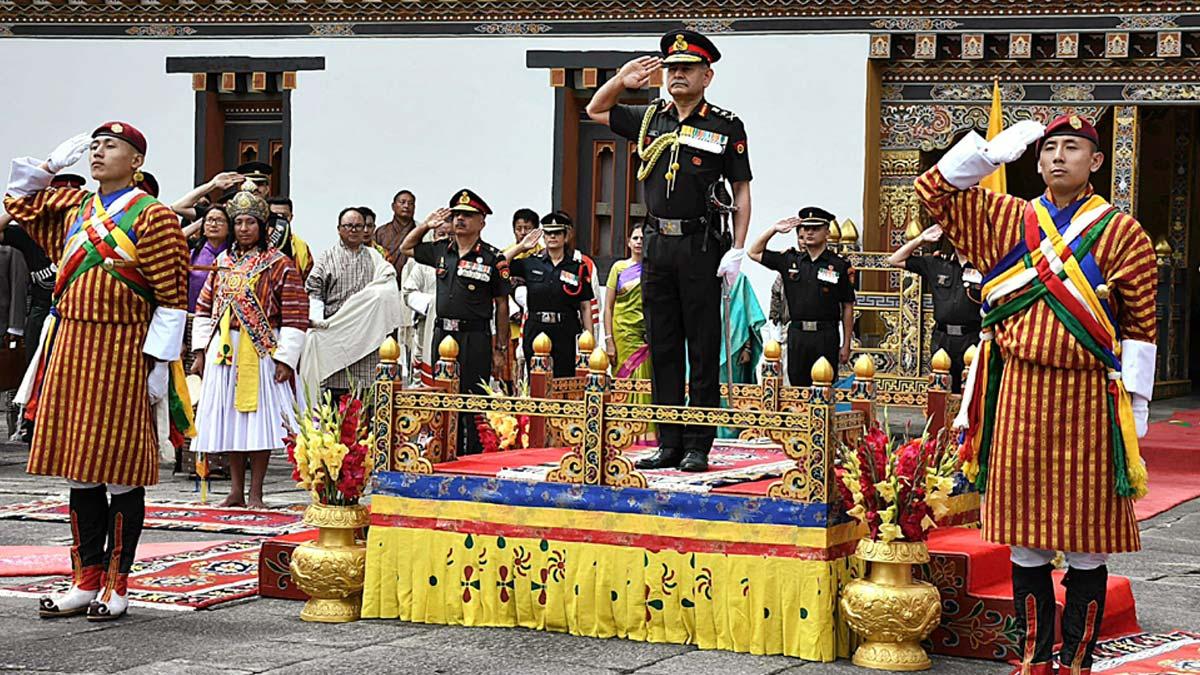 IMAGE: General Dwivedi received a guard of honour during his visit to Tashichho Dzong.