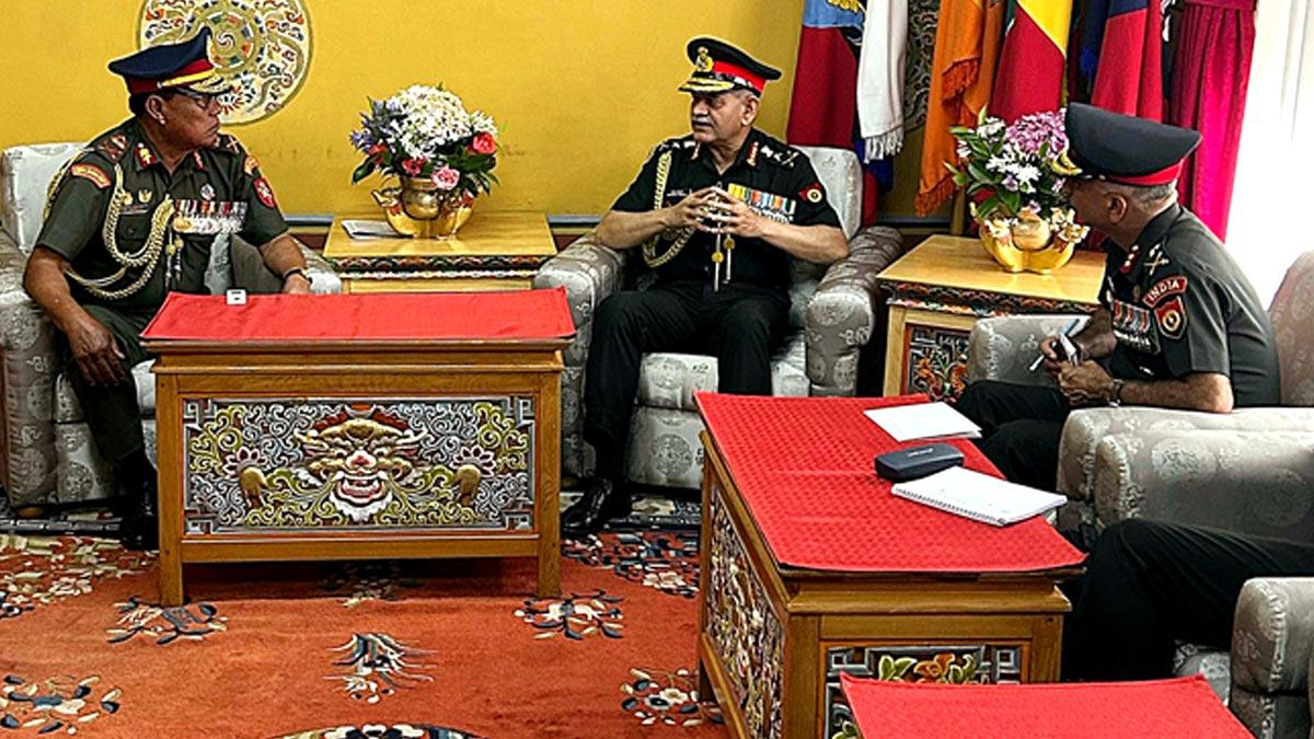 IMAGE: General Dwivedi in strategic discussions with Bhutan's army chief General Batoo Tshering.