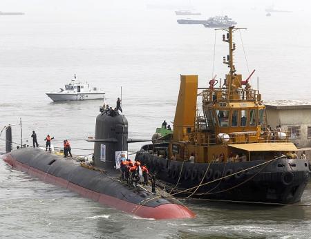 IMAGE: Navy's Scorpene submarine INS Kalvari being escorted by tugboats as it arrives at Mazagon Docks in Mumbai. Photograph: Shailesh Andrade/Reuters/Files