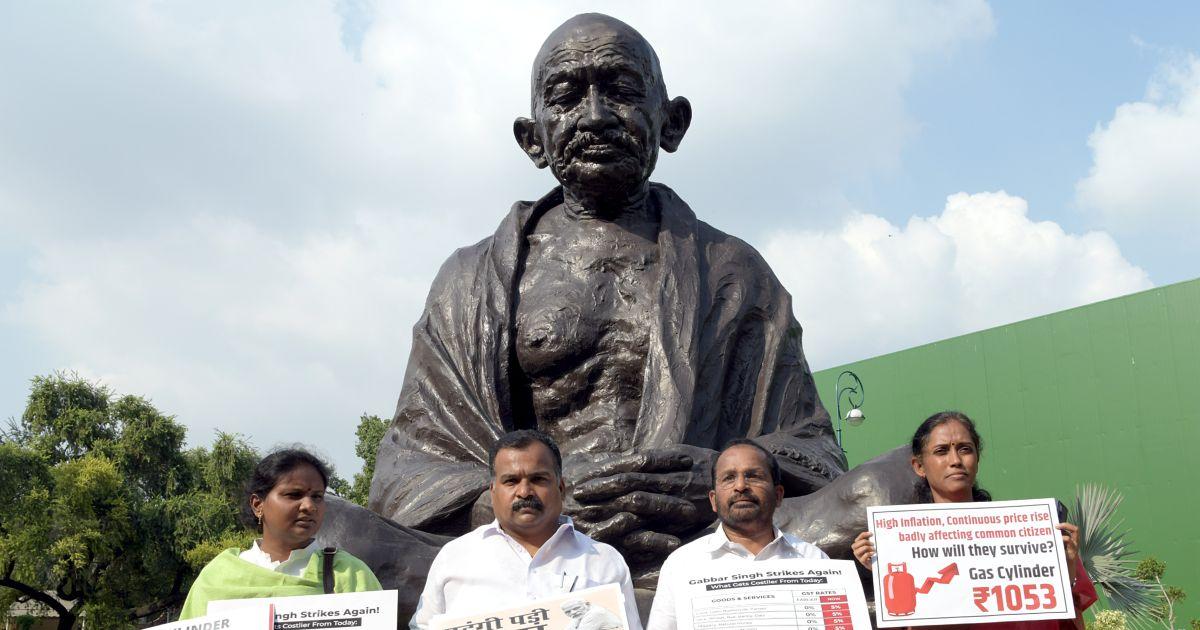 The suspended MPs staged a protest at the Gandhi statue inside the Parliament premises.