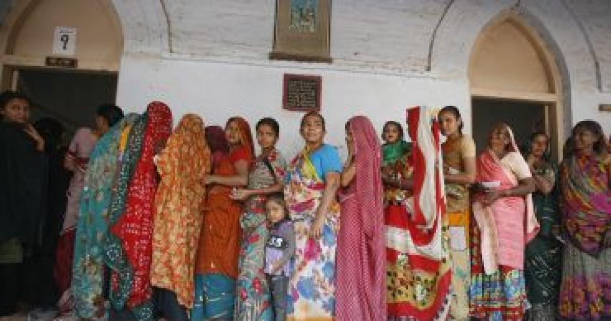 Image: Women stand in a queue outside a polling booth during the first phase of Gujarat elections at Viramgam town near Ahmedabad