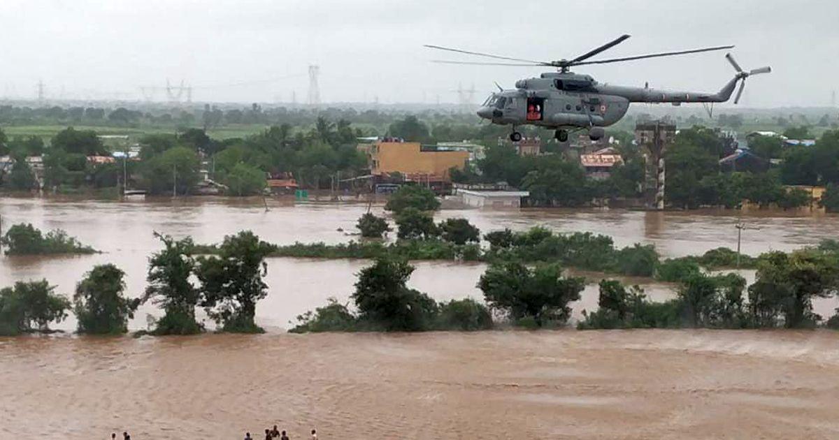 An Indian Air Force helicopter on Saturday rescued two persons who were left clinging to an electric pole for several hours amid flooding in a low-lying area of Gujarat's Junagadh district due to heavy rains, an official said.
