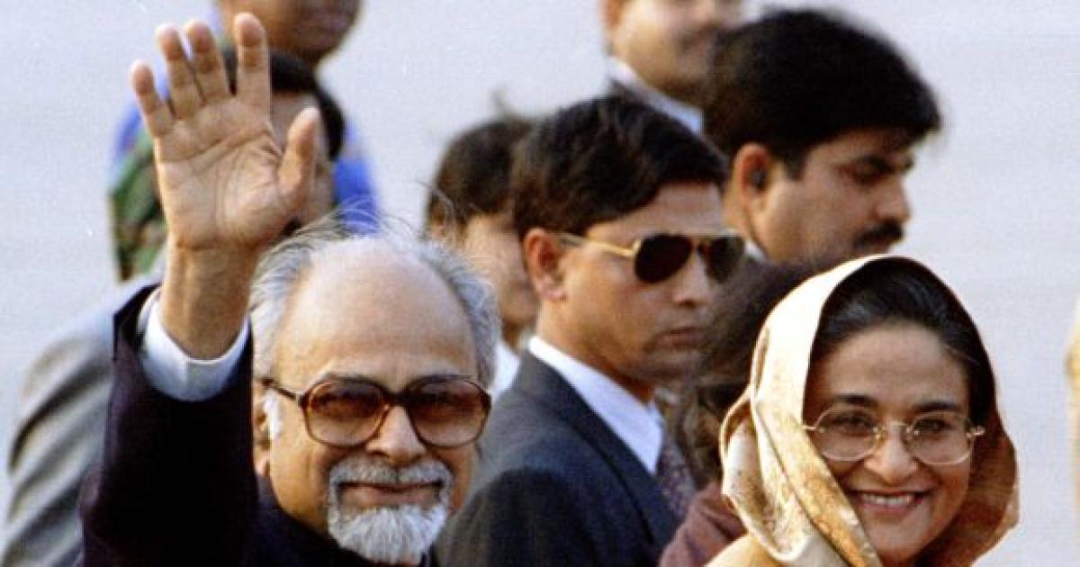 Photograph: I K Gujral with Bangladesh Prime Minister Sheikh Hasina at Dhaka airport in January 1998. Photograph: Rafiquar Rehman/Reuters
