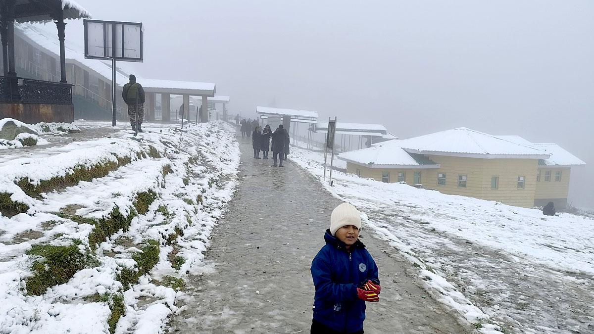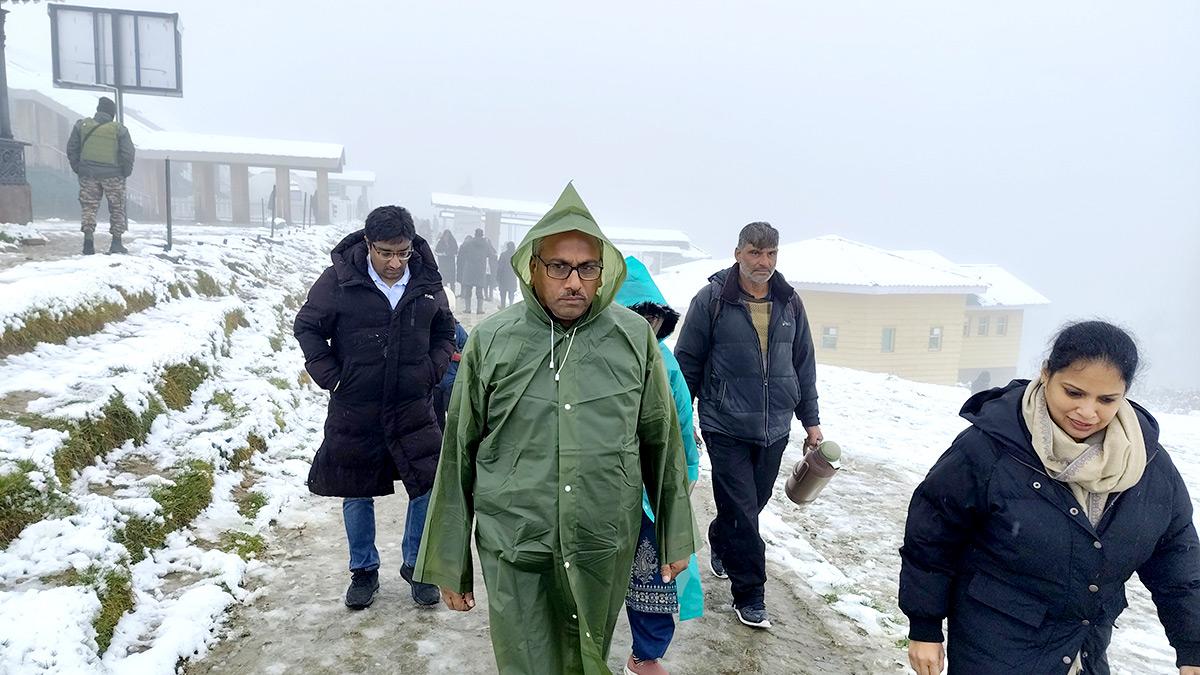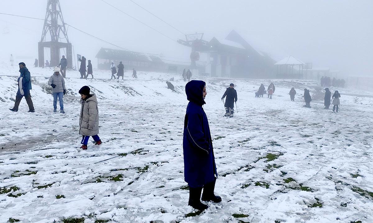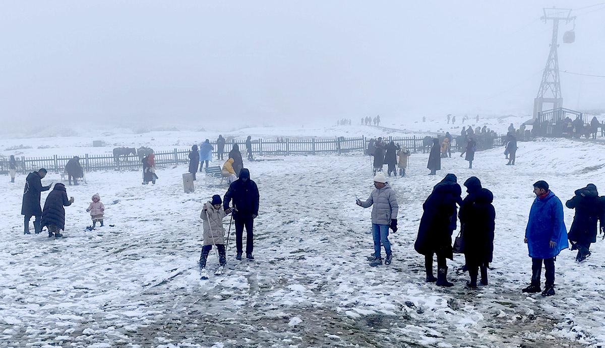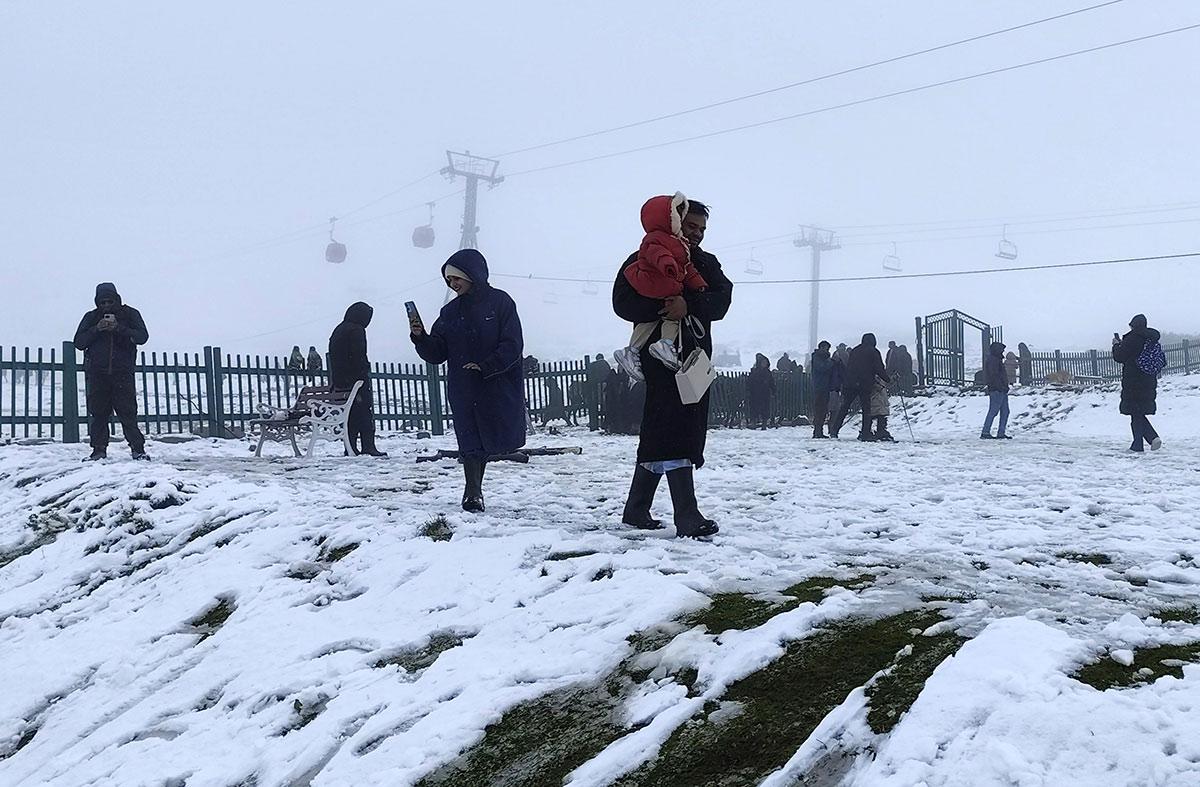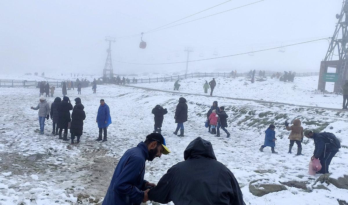 Tourists enjoy the season's first snowfall at Kongdoori in Gulmarg on Monday, October 6, 2025.