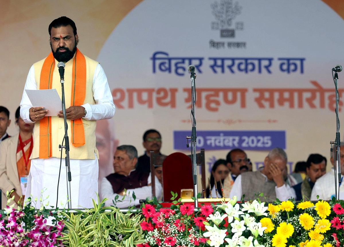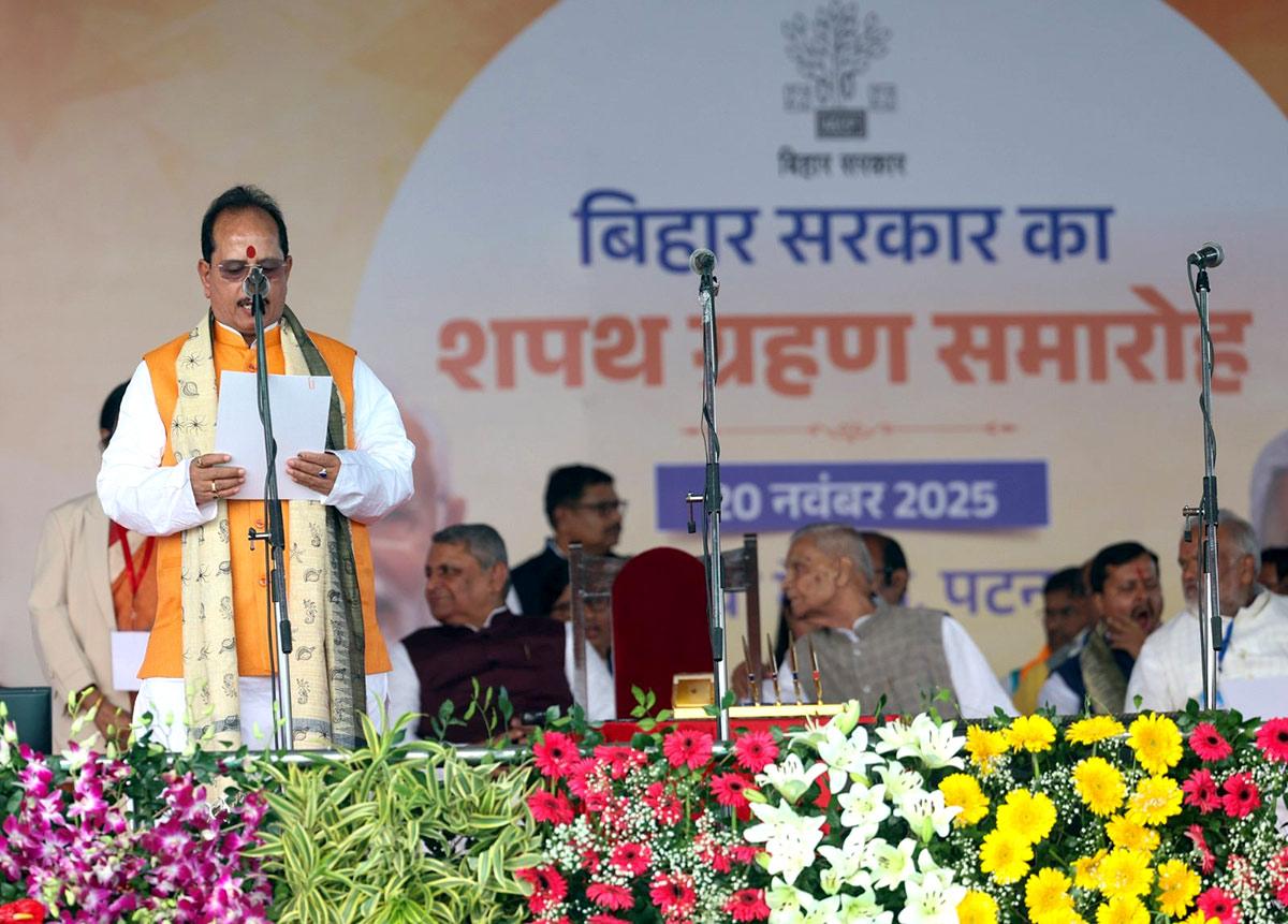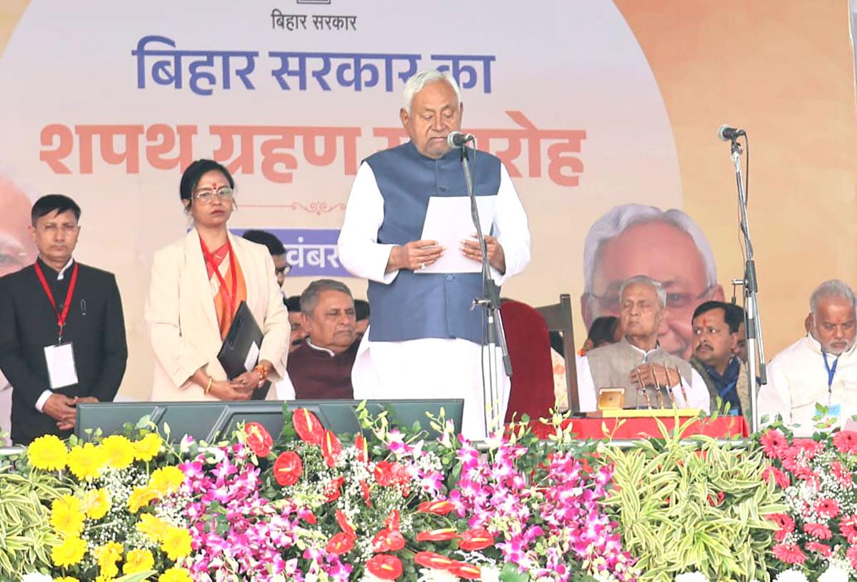 IMAGE: Nitish Kumar takes the oath of office. Photograph: @Jduonline/X