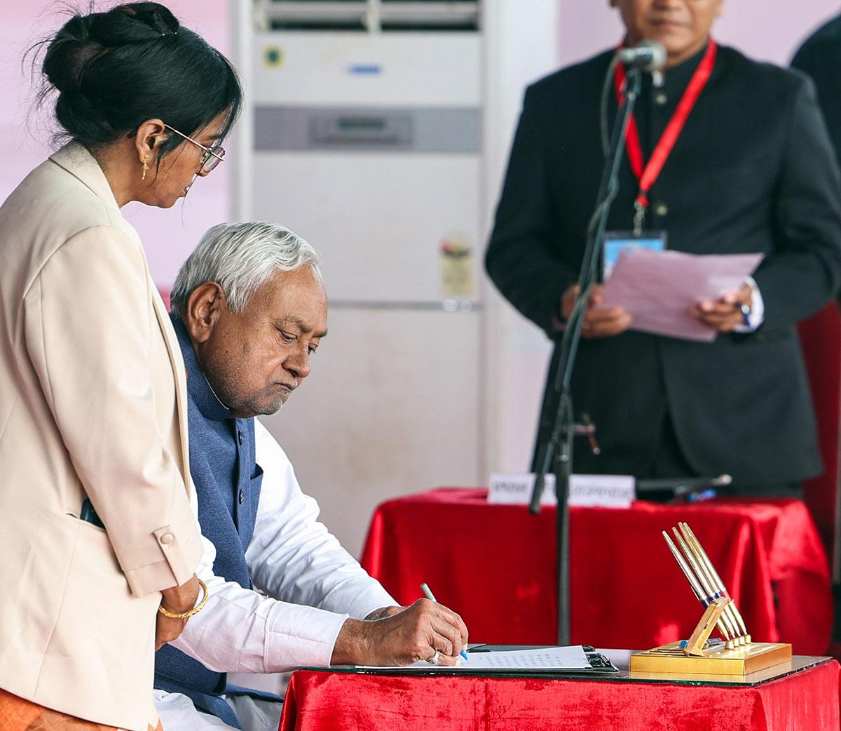 IMAGE: Nitish Kumar signs a document after being sworn in. Photograph: DPR PMO/ANI Photo