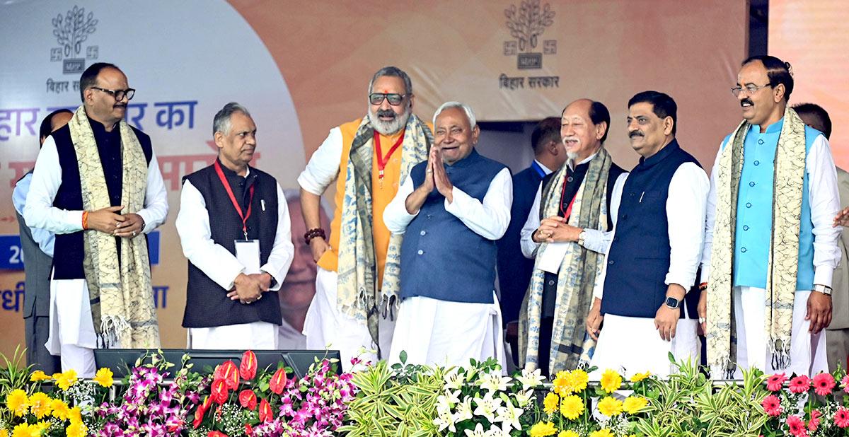 IMAGE: Nitish Kumar, Union Minister of Textiles Giriraj Singh, Nagaland Chief Minister Neiphiu Rio, Uttar Pradesh Deputy Chief Ministers Keshav Prasad Maurya and Brajesh Pathak, Janata Dal-United Working President Sanjay Kumar Jha. Photograph: ANI Photo