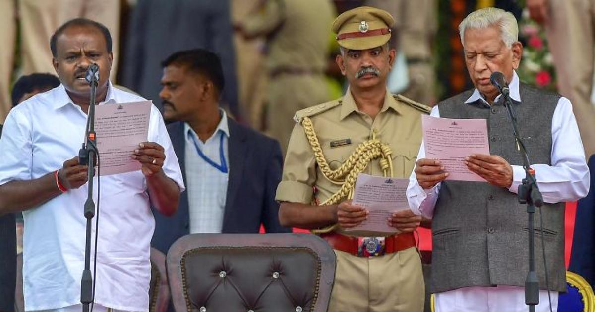Kumaraswamy, the third son of JD-S supremo and former prime minister H D Deve Gowda, was administered the oath of office and secrecy by Governor Vajubhai Vala on a huge dais outside the majestic Vidhana Soudha, the seat of power in Karnataka.
