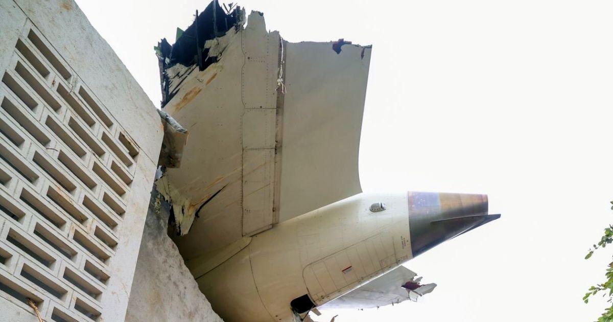 IMAGE: A tail of an Air India Boeing 787 Dreamliner plane that crashed is seen stuck on a building after the incident in Ahmedabad. Photograph: ANI Photo