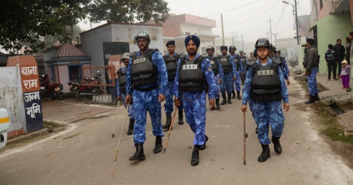 Image: RAF Jawans patrolling the area on the day of anniversary of Babri Masjid demolition in Ayodhya. Photograph: PTI Photo