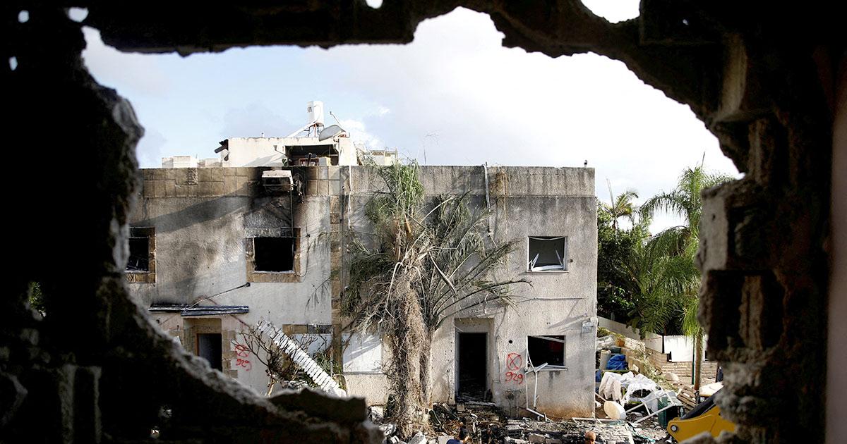 IMAGE: Israeli men hang an Israeli flag over a damaged building that was hit by a rocket from Lebanon as emergency personnel work at houses damaged following the attack. Photograph: Shir Torem/Reuters