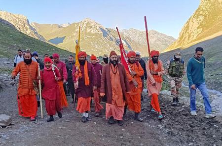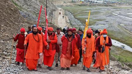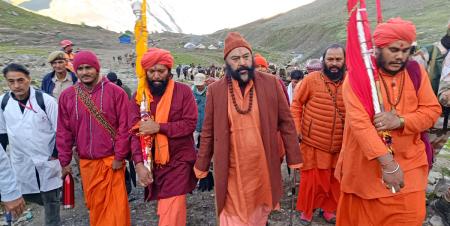 The mace, accompanied by head priest Mahant Deependra Giri, began its journey from the Dashnami Akhara in Srinagar on Monday, August 4, 2025, and reached the Chhari Vishram Sthal in Pahalgam.