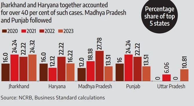 Jharkhand and Haryana together accounted for over 40 per cent of such cases. Madhya Pradesh and Punjab followed.