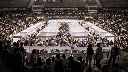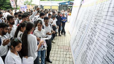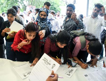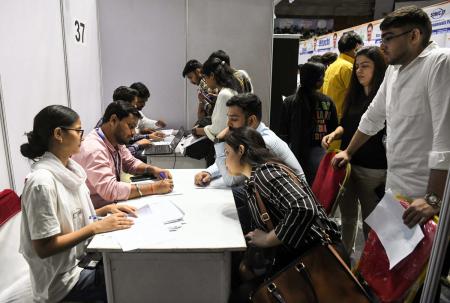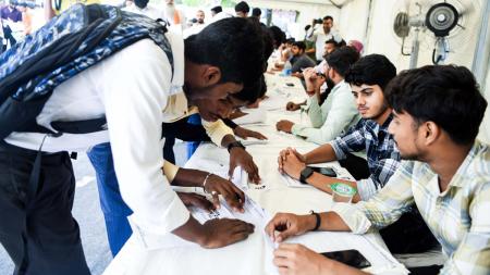IMAGE: Job aspirants undergo a registration process during the mega job fair. All photographs: Rahul Singh/ANI Photo