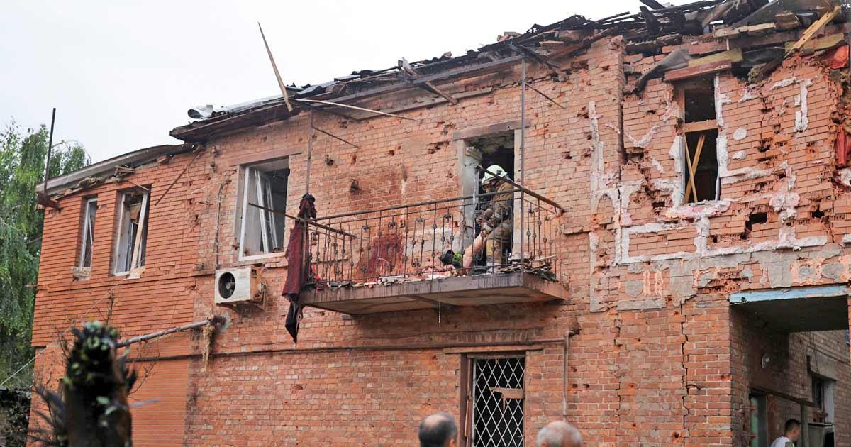 IMAGE: A resident removes debris from his house damaged by a Russian strike in Kharkiv. Photograph: Sofiia Gatilova/Reuters
