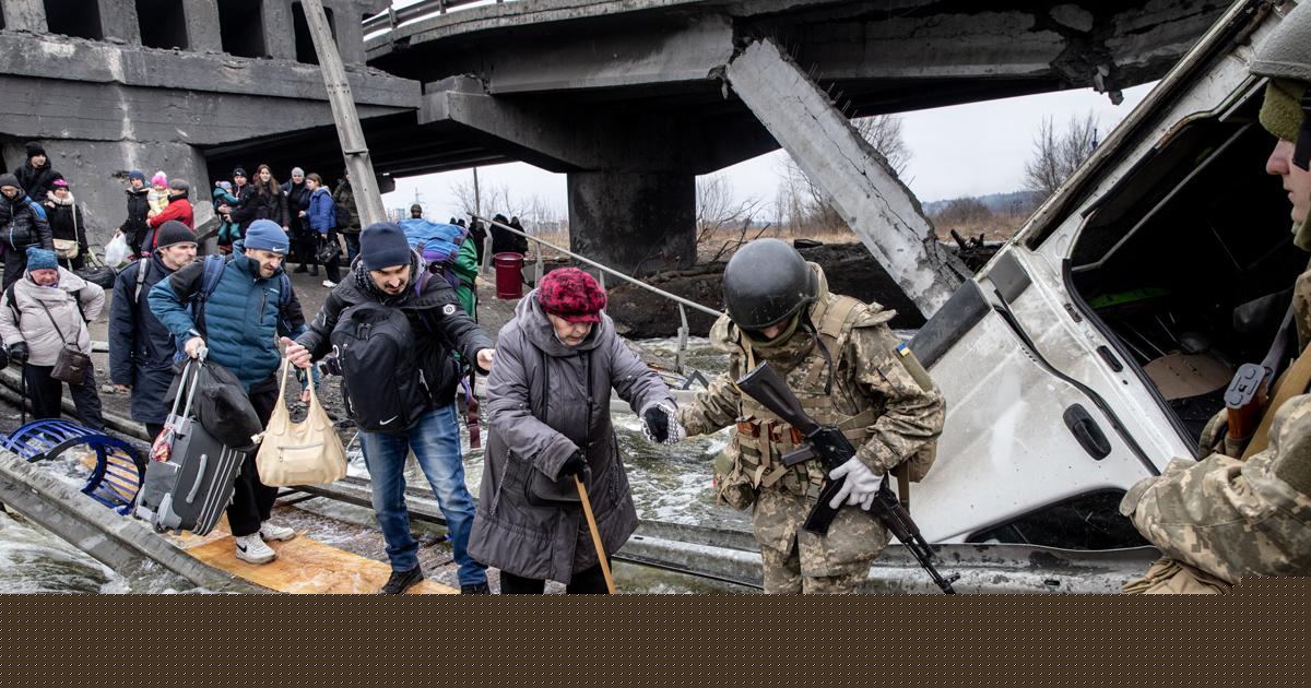 IMAGE: Residents of Irpin flee heavy fighting via a destroyed bridge as Russian forces entered the city.