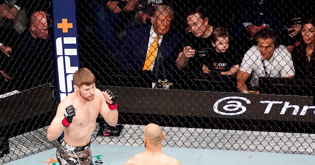 IMAGE: Donald Trump, Elon Musk and son X Æ A-12, and Dana White, CEO of the Ultimate Fighting Championship, watch the Bryce Mitchell versus Jean Silva bout, here and below. Photograph: Nathan Howard/Reuters