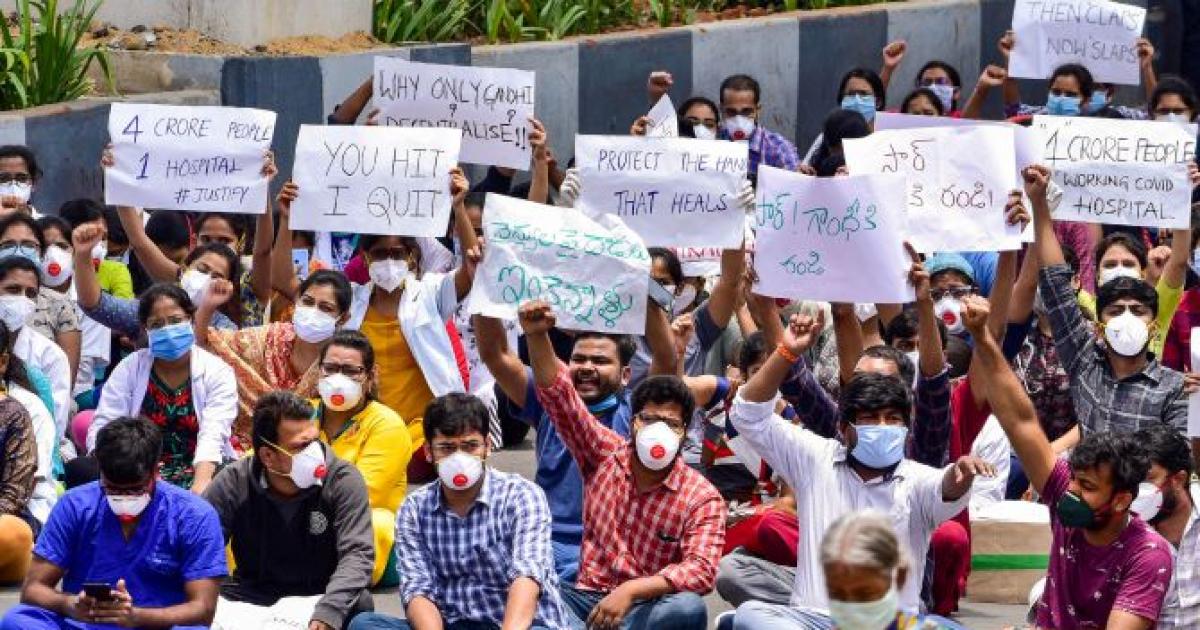 IMAGE: PG doctors stage a protest against alleged misbehavior and manhandling of doctors treating COVID-19 patients, near Gandhi Hospital in Hyderabad, on Wednesday. Photograph: PTI Photo