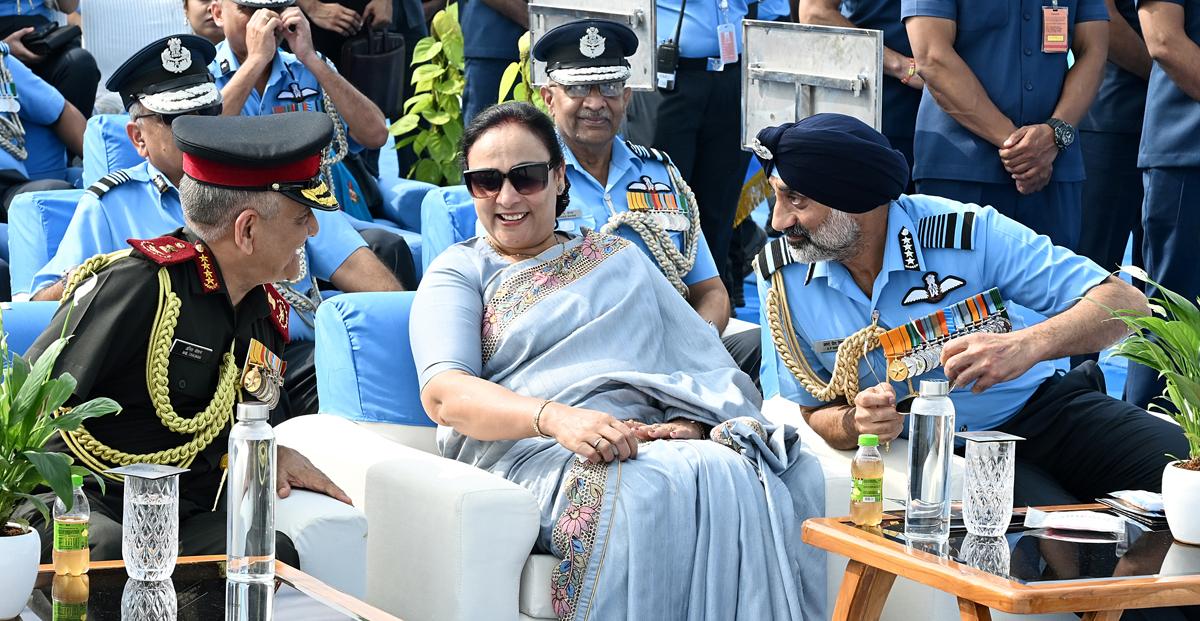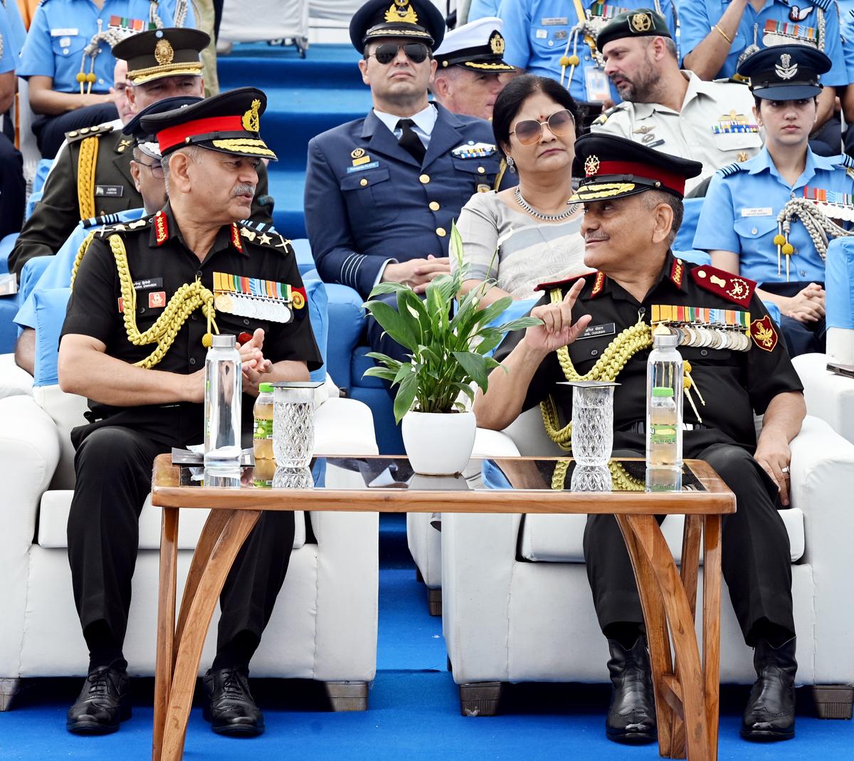 IMAGE: General Anil Chauhan interacts with Air Chief Marshal Amar Preet Singh as Mrs Sarita Singh listens in. Photograph: Jitender Gupta/ANI Photo