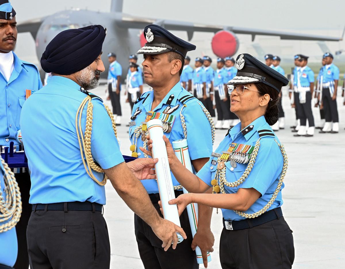 IMAGE: Chief of the Air Staff Air Chief Marshal Amar Preet Singh felicitates IAF officers on Air Force Day. Photograph: Jitender Gupta/ANI Photo