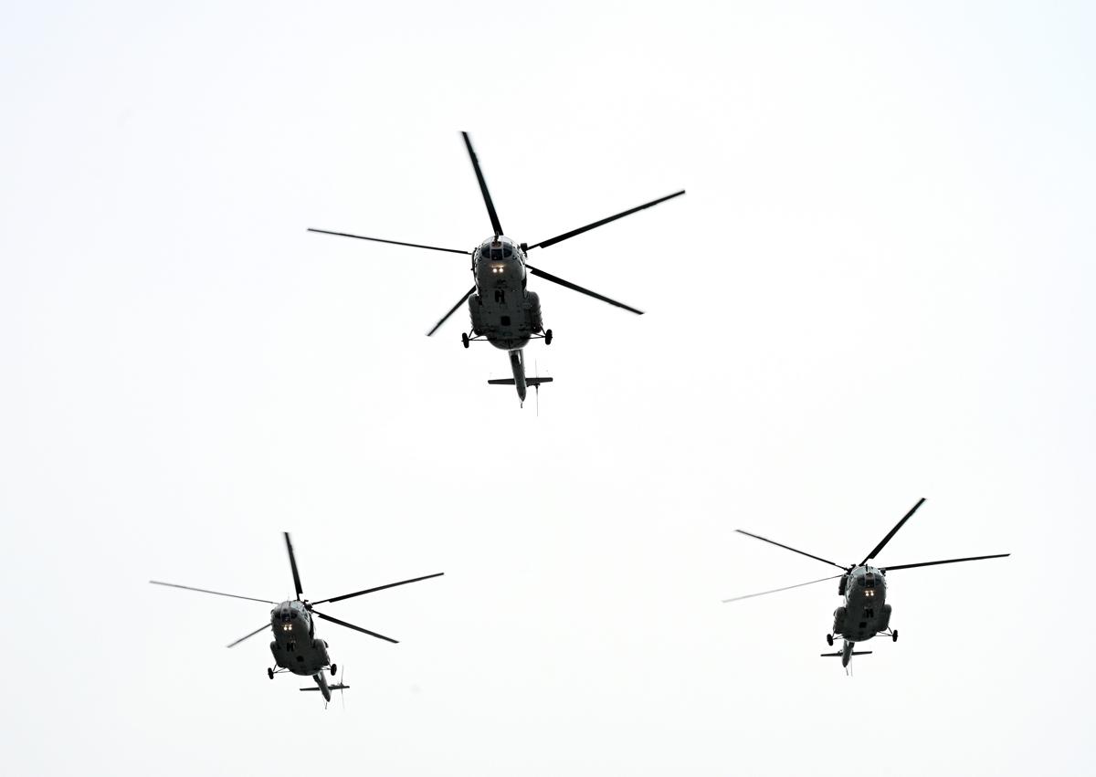 IMAGE: Indian Air Force helicopters fly past during the Air Force Day celebrations at the Hindan Air Force Station in Ghaziabad on Wednesday, October 8, 2025, here and below. Photograph: Press Information Bureau