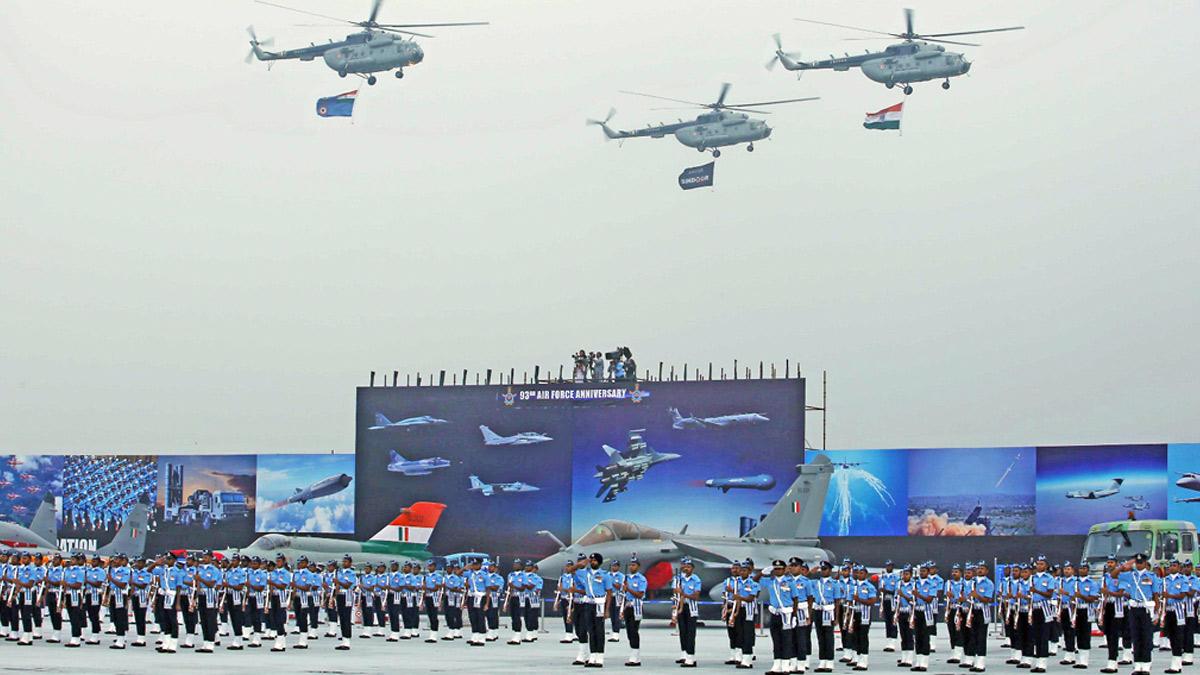 IMAGE: Air force personnel during the Air Force Day celebrations. Photograph: Jitender Gupta/ANI Photo