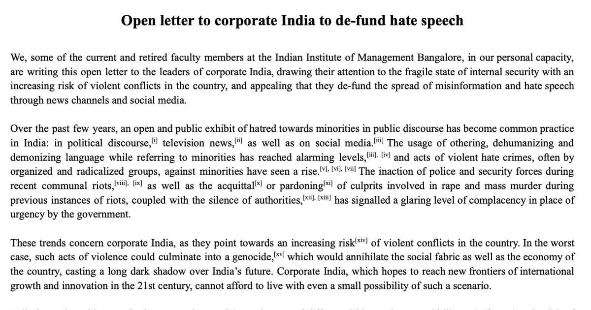 A group of current and retired faculty members at the Indian Institute of Management-Bangalore (IIM-B) has asked leaders of corporate India to "de-fund" the spread of misinformation and hate speech through news channels and social media.