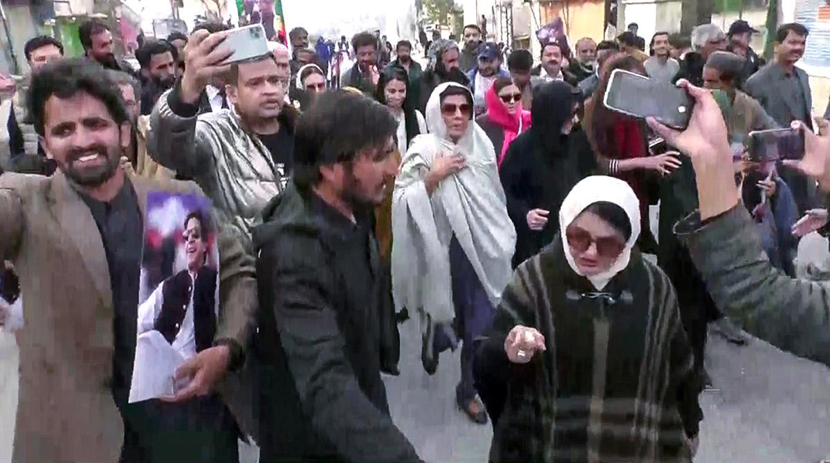 IMAGE: Uzma Khan and Aleema Khan protest outside the Adiala Jail, here and below. All photographs: Video Grab/ANI Photo