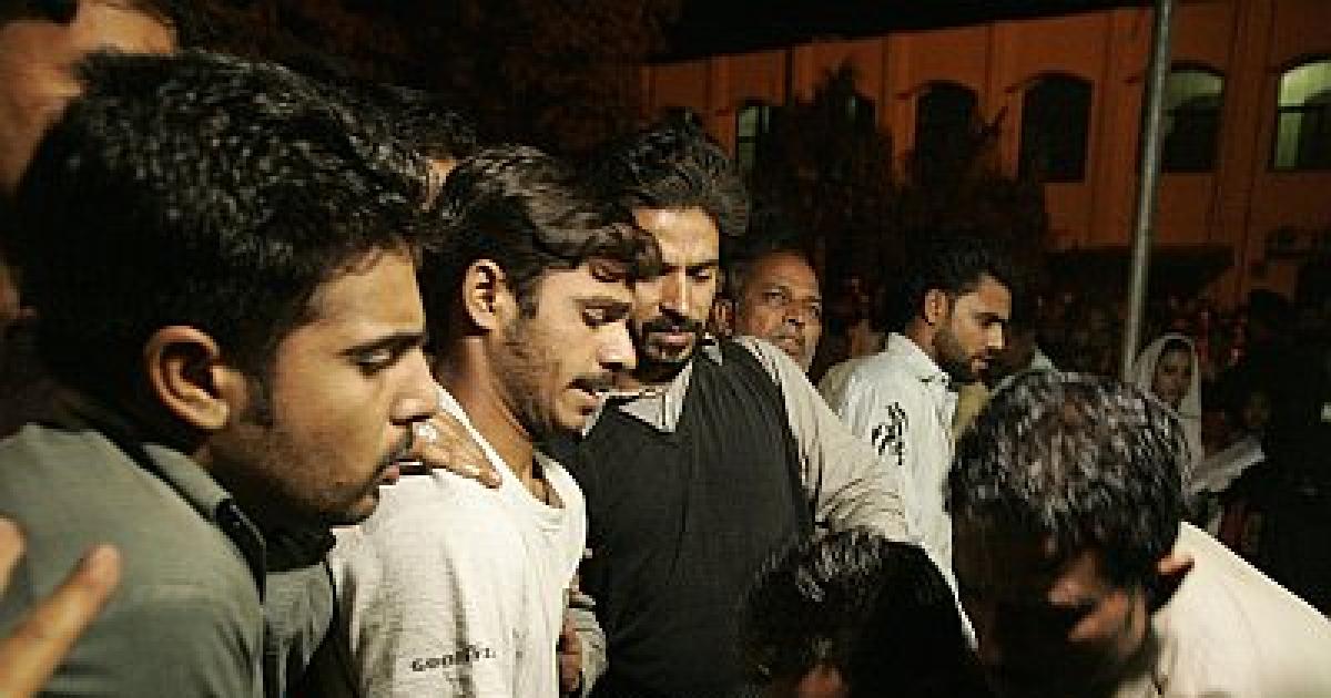 Image: A Pakistani man is being comforted by others while mourning the death of a relative who was killed in the suicide bomb attack in Wagah border near Lahore on November 2, 2014. Photograph: Mani Rana/Reuters.