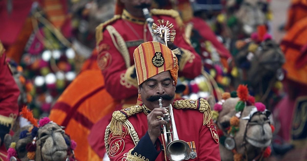 Image: A member of the Border Security Force band rides his camel as he performs during the Republic Day parade. Photograph: Ahmad Masood/Reuters