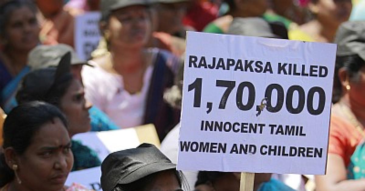 Image: A demonstrator holds a placard during a protest against Sri Lanka for alleged war crimes