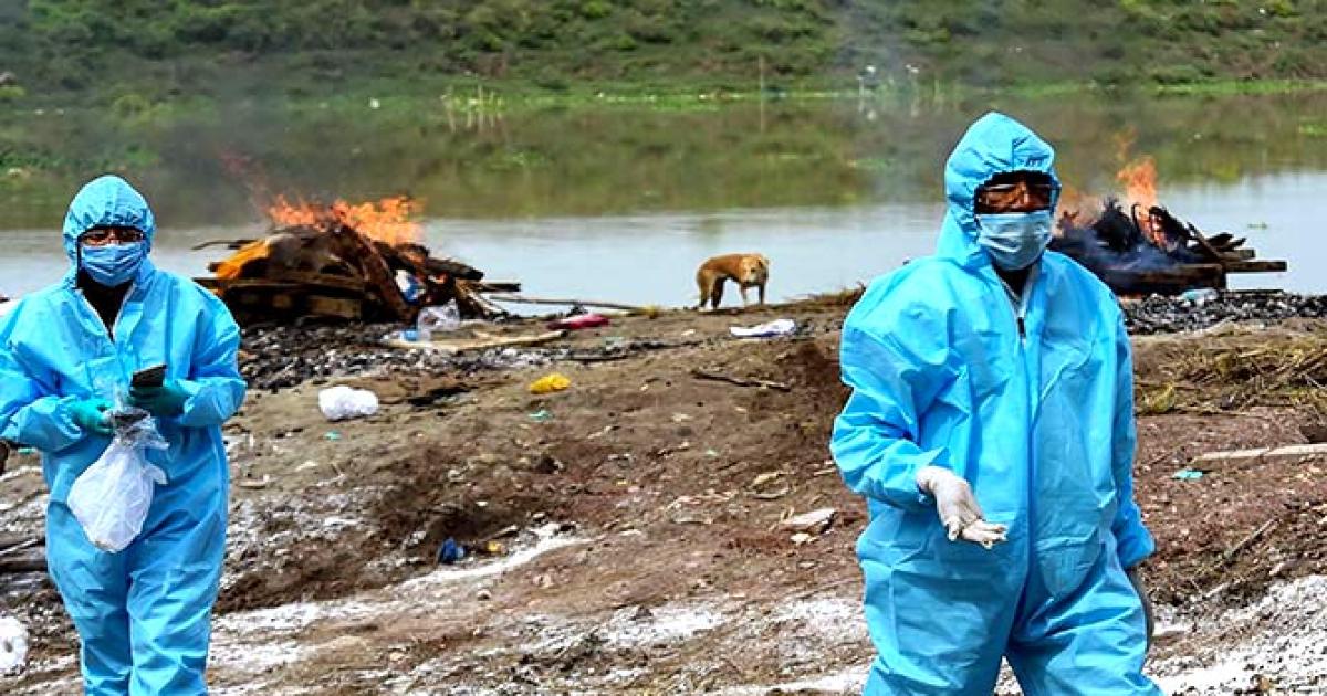 IMAGE: Health workers and family members wearing PPE leave after the cremation of a COVID-19 victim, at a crematorium, in Patna. Photograph: PTI Photo