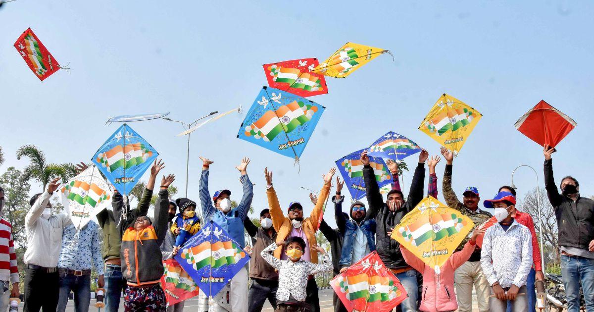 IMAGE: People hold kites as they pose for a photograph on Makar Sankranti in Bhopal, on Friday, January 14, 2022. Photograph: PTI Photo